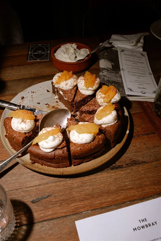 Dark chocolate & almond torta - with whipped cream & oranges (v, contains nuts)